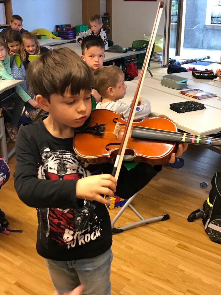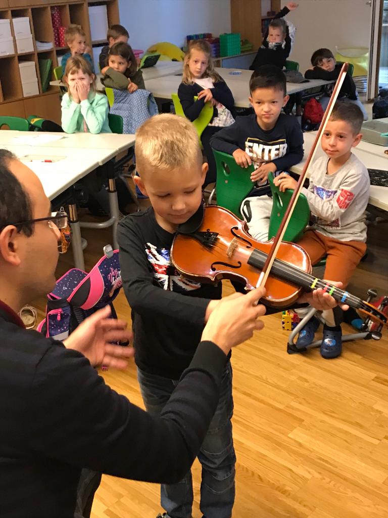 Edwin Cáceres-Peñuela, Lehrer der Wilhelm-Kienzel Musikschule Bad Aussee besuchte die Kinder der ersten und zweiten Klassen, um ihnen die Violine vorzustellen. Zum Schluss durfte jedes Kind das Instrument selber ausprobieren. Das Interesse ein Musikinstrument zu erlernen wurde auf jeden Fall bei vielen Kindern geweckt
