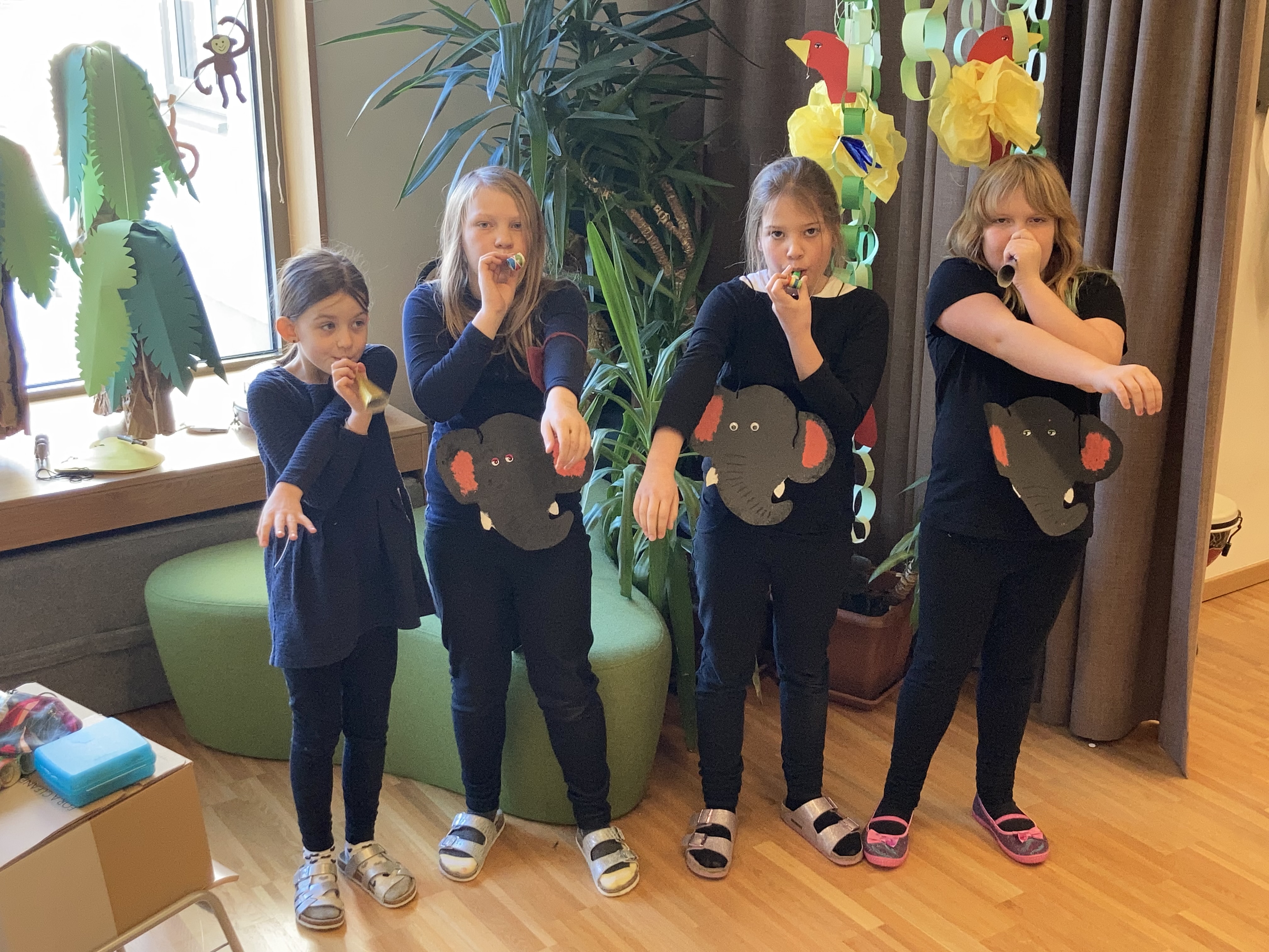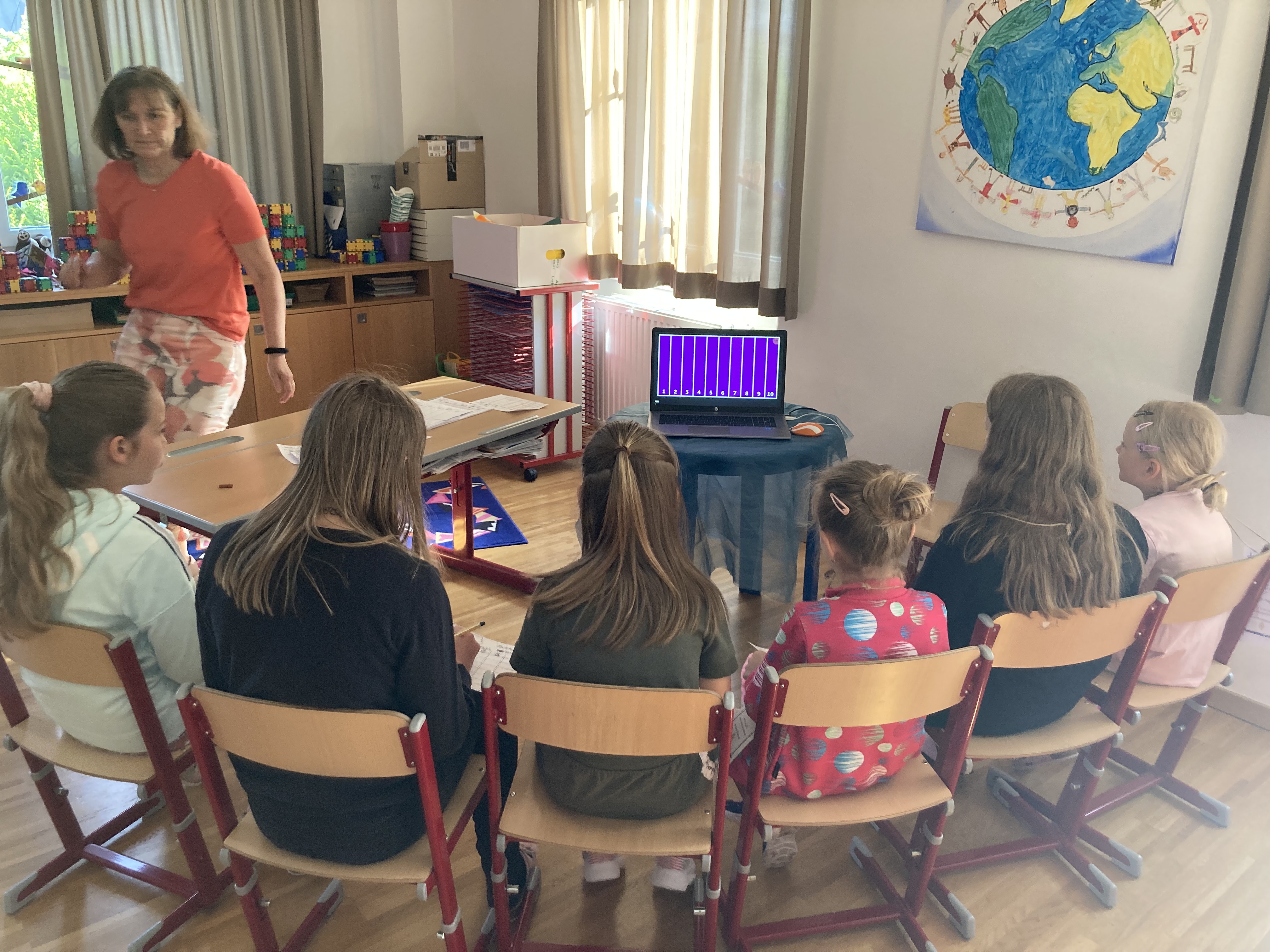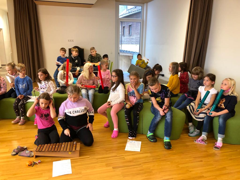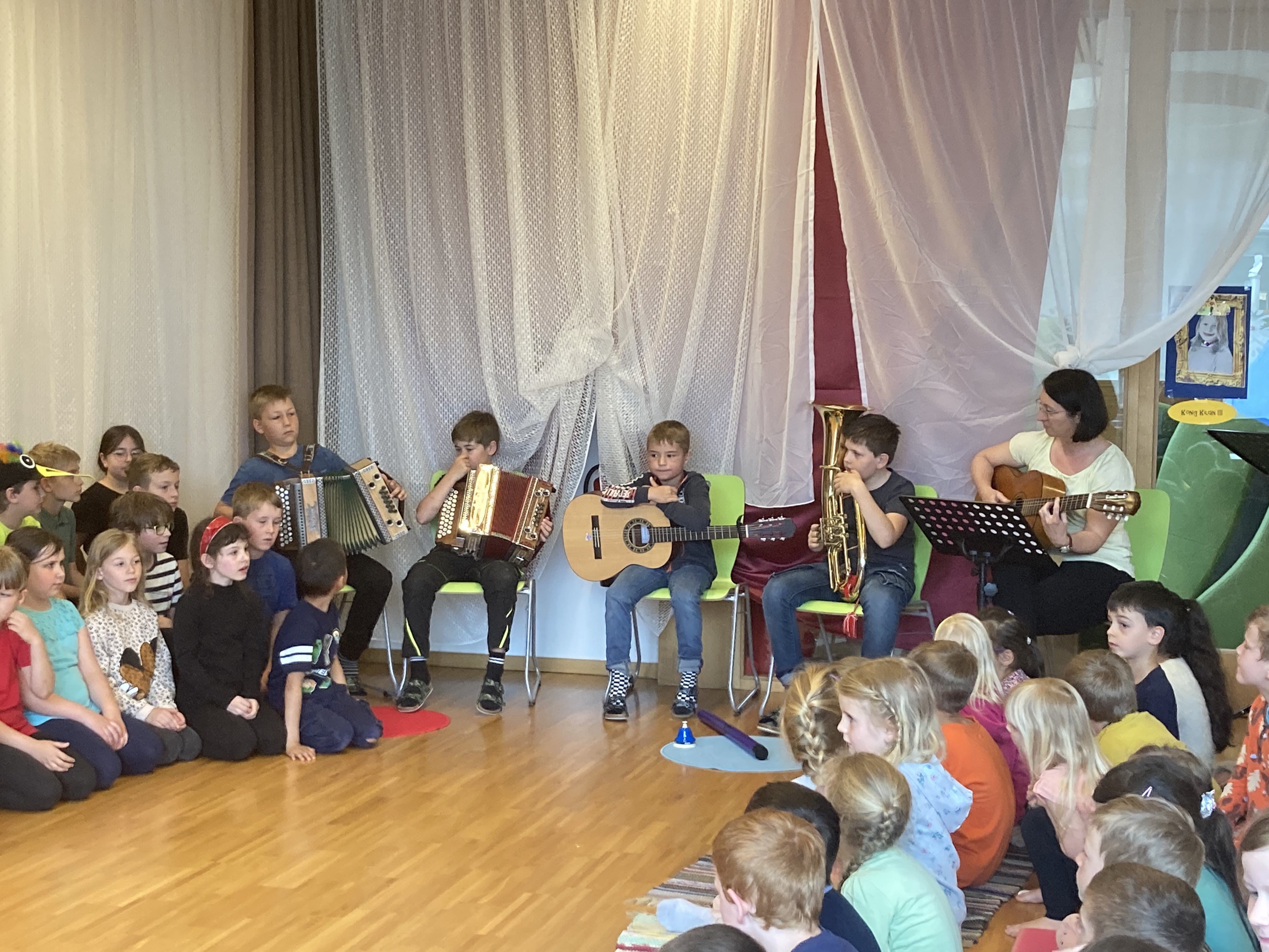 Ebenso durften sie Zwitschervögel, Wasserrauschen, Regentropfen, Gewitterstürme, Nebelschwaden und Bäche musikalisch durch Trommeln, Triangeln, Rasseln ausdrücken und darstellen.