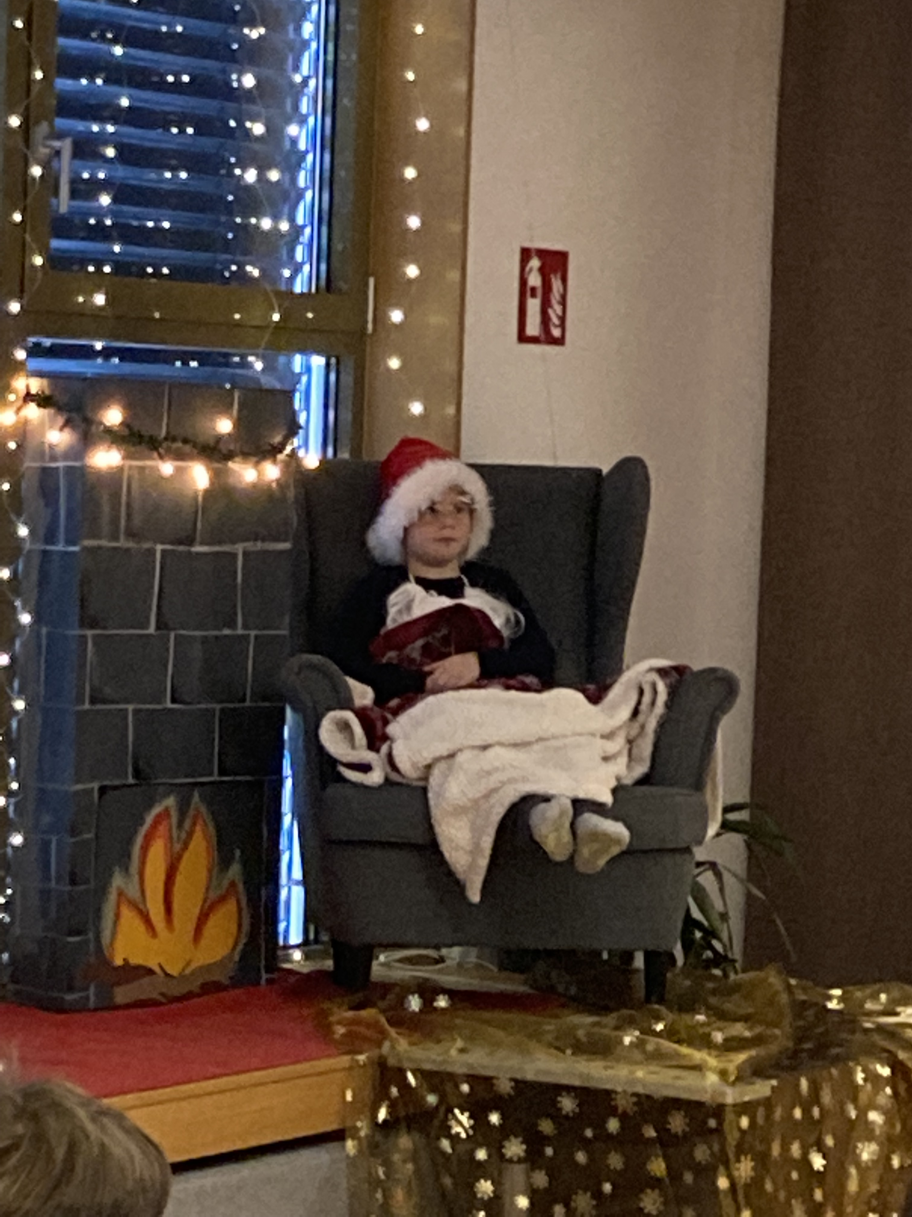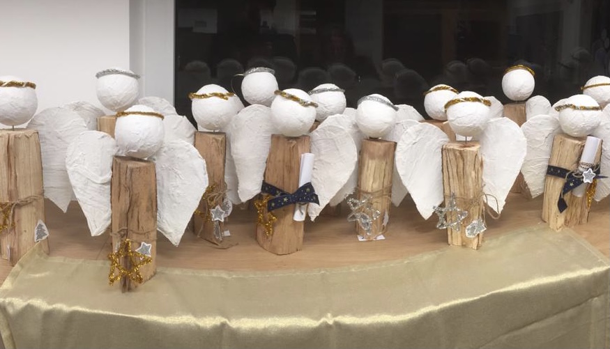 Mit einem selbst gebastelten Engel stellten sich die Schüler*innen bei Lese-Doris zuhause ein und bedankten sich mit zwei Liedern bei ihr.