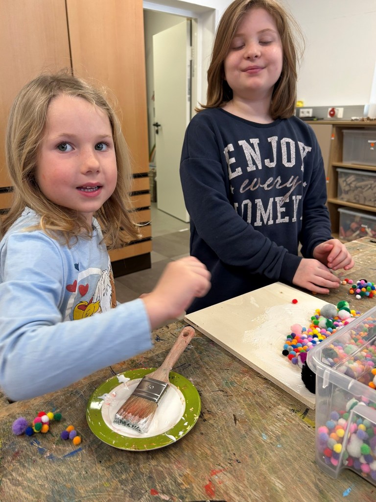 Die 3b-Klasse gestaltete gemeinsam mit den Schulanfängerinnen und Schulanfängern des Stadtkindergartens kreative Fühlplatten aus verschiedenen Materialien.