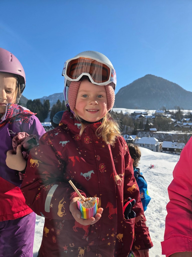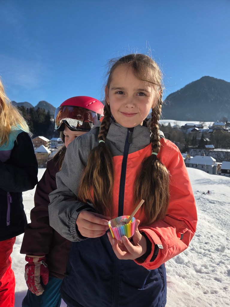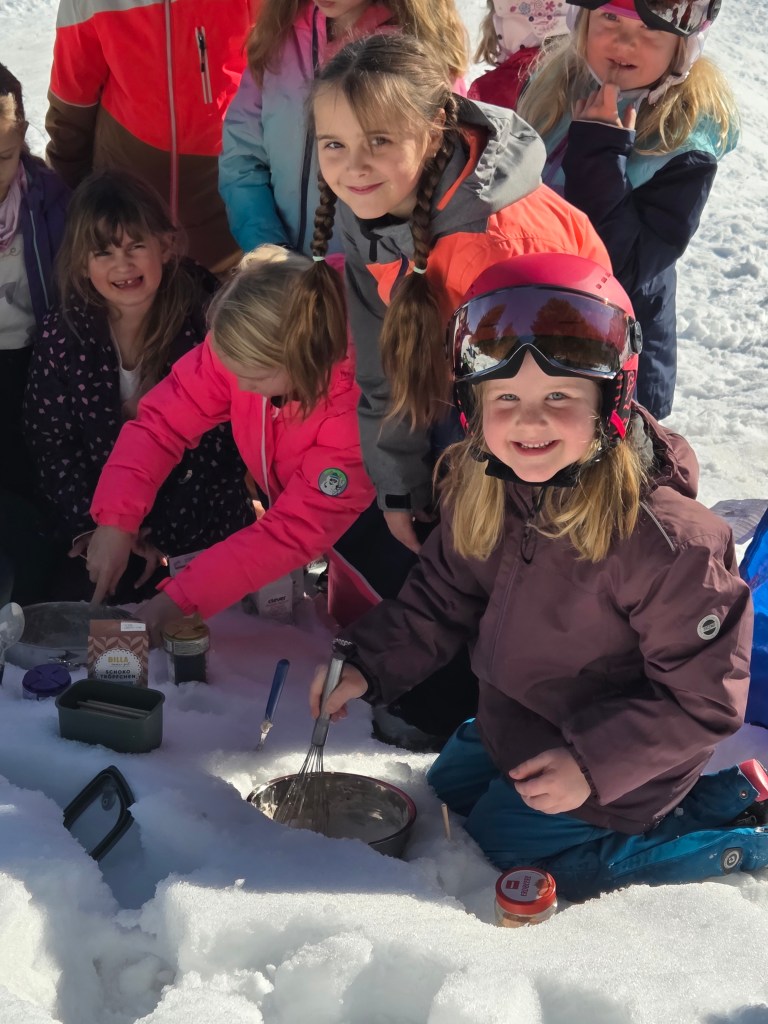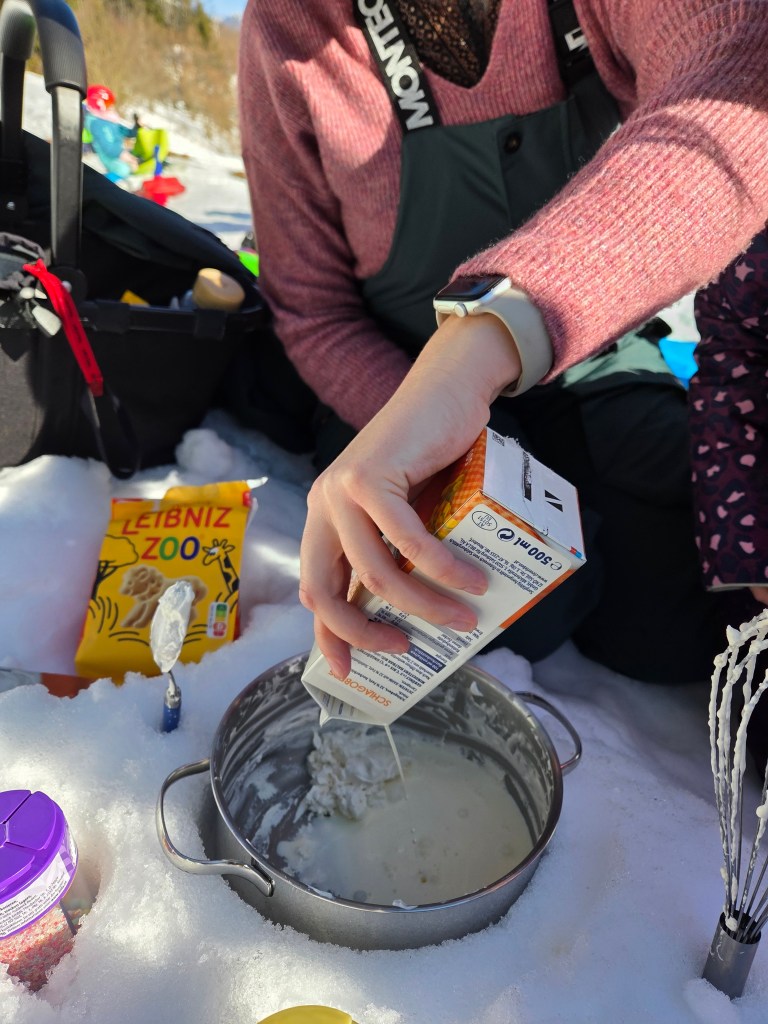 Als besondere Überraschung wurde direkt vor Ort selbstgemachtes Eis hergestellt – mit Salz, einer Schüssel, Schlagobers und viel Muskelkraft am Schneebesen. Anschließend wurde das Eis gemeinsam in der Sonne genossen. Ein rundum gelungener Vormittag voller Bewegung, Freude und Begeisterung!