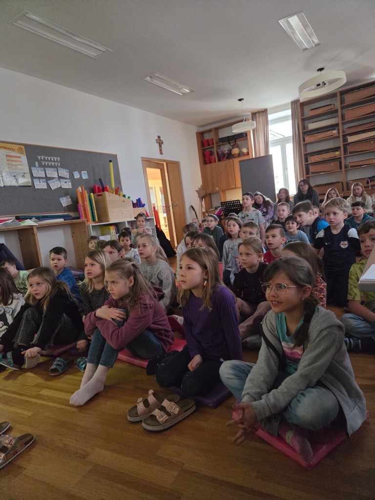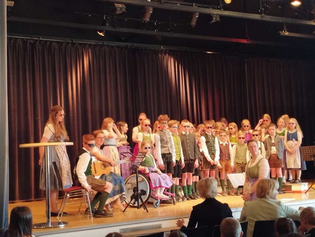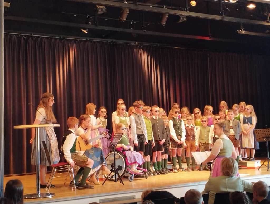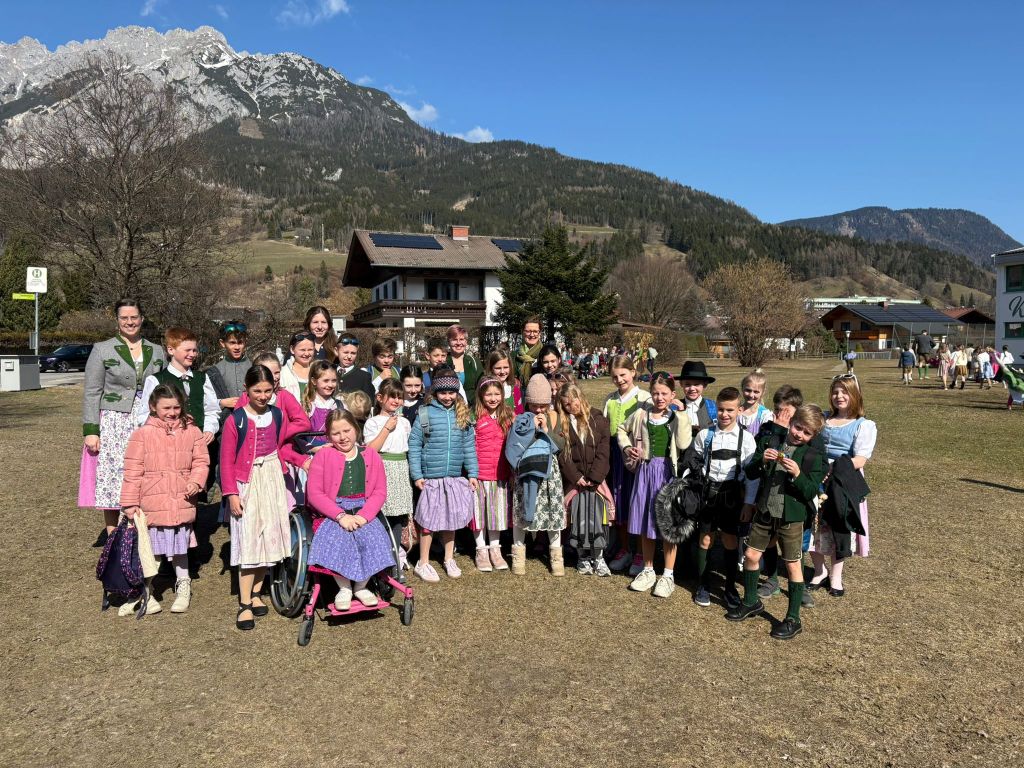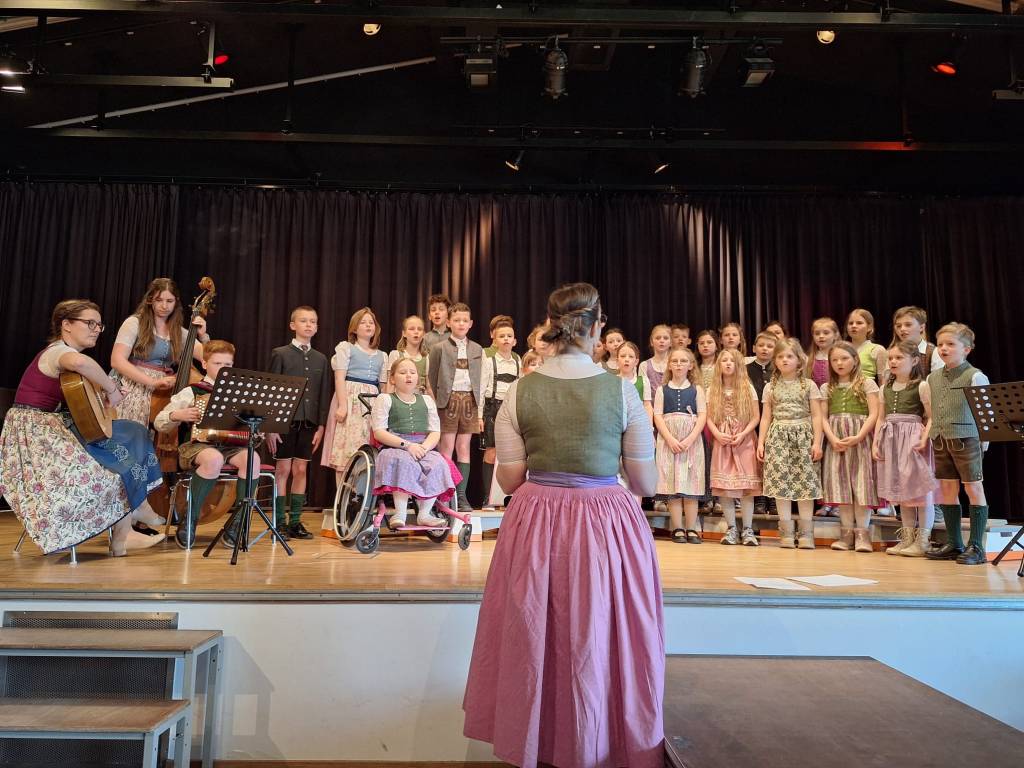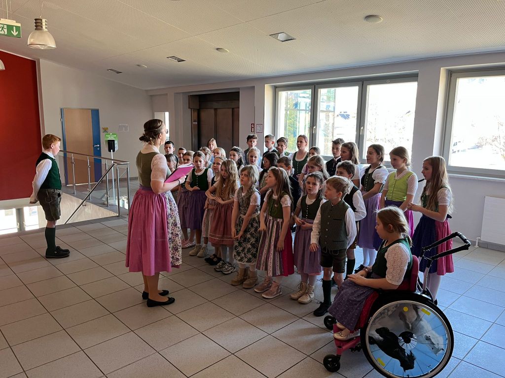 Bereits um 7:45 Uhr startete der Bus bei der Schule und brachte die motivierte Gruppe nach Gröbming. Dort präsentierten die Kinder gemeinsam mit ihren Lehrerinnen die Lieder „Hej, Hello, Bonjour“, „Boarisch Hiasl“ und „Der Gorilla mit der Sonnenbrille“. Für ihren gelungenen Auftritt erhielten sie großen Applaus und viel Lob.