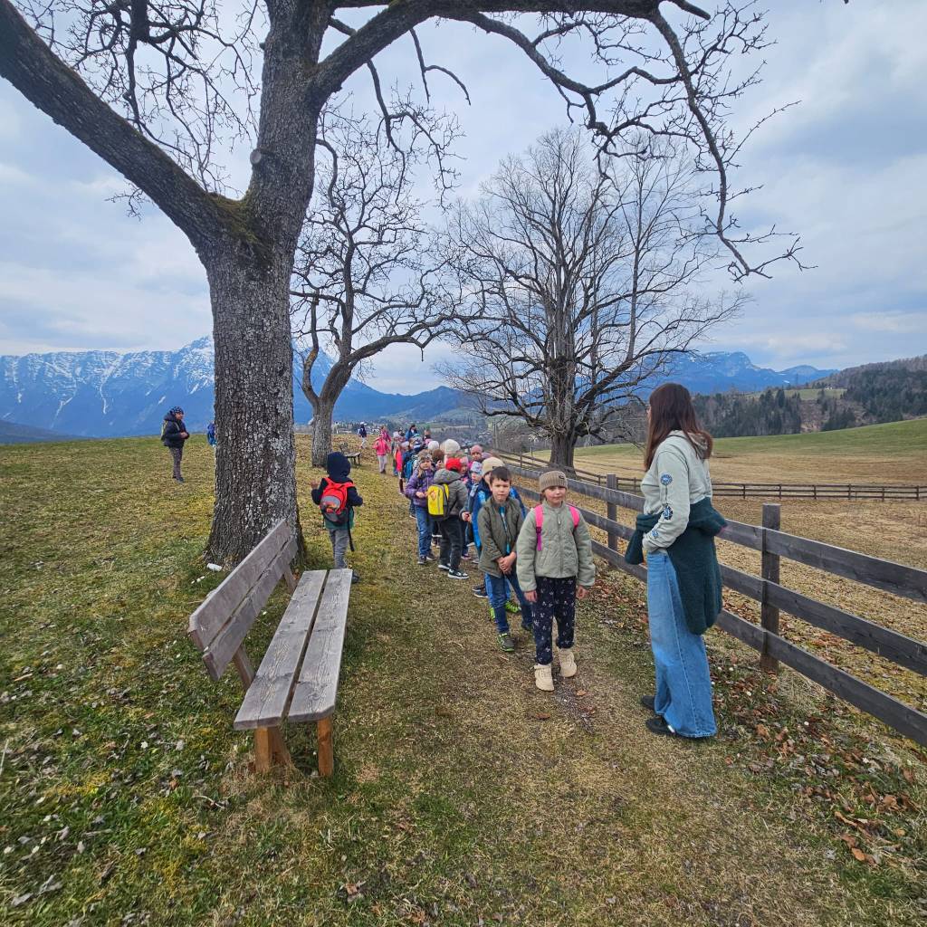 Die Kinder der 2b Klasse unternahmen im Unterrichtsfach Bewegung und Sport gemeinsam mit der 2a eine Wanderung über den Kreuzangerweg. Vorbei an der Linde führte der Weg weiter in die Scheibnergasse bis ins „Hasendorf“ der Familie Köberl.