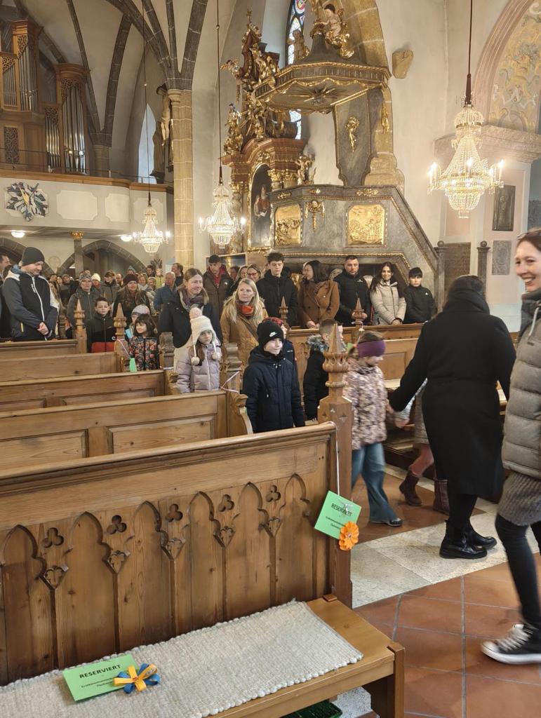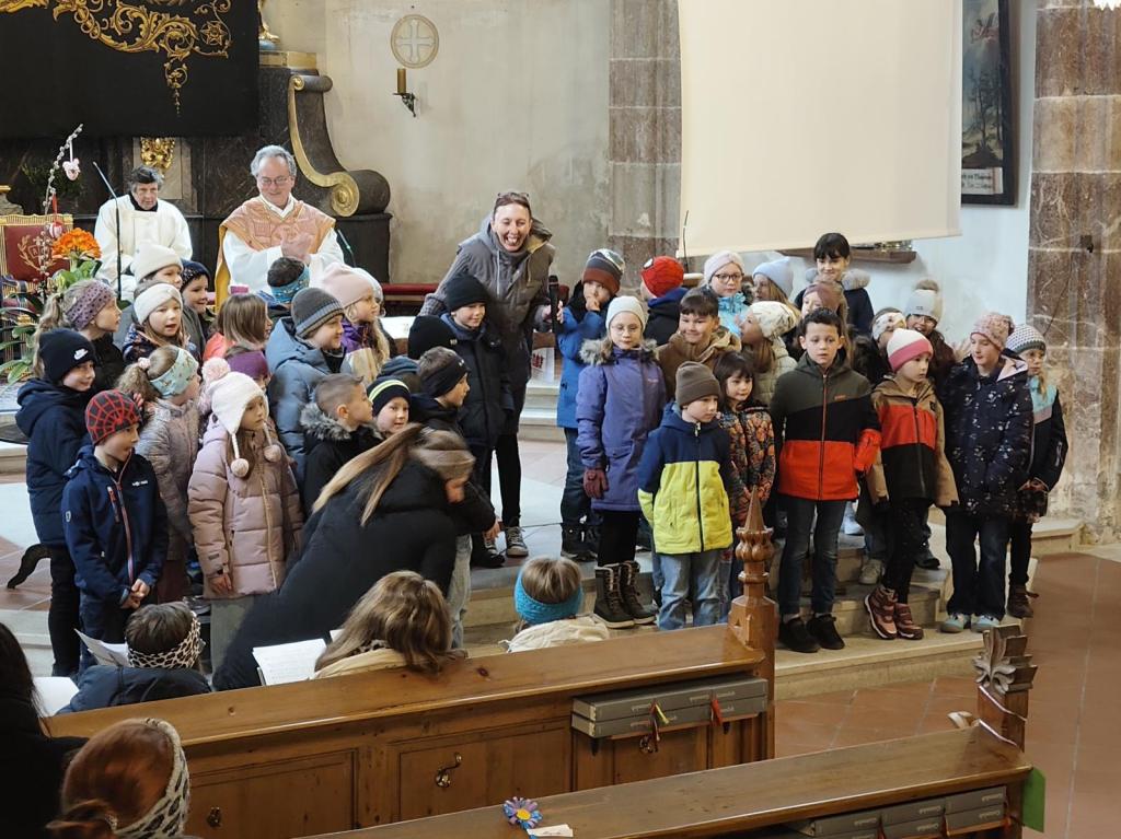 Am 15. März wurden die diesjährigen Erstkommunionkinder im Rahmen des Sonntagsgottesdienstes vorgestellt. Gestaltet wurde dieser von Pfarrer Dr. Michael Unger, den Pädagoginnen, dem KIWA-Orchester und Klaus Trummer an der Orgel.