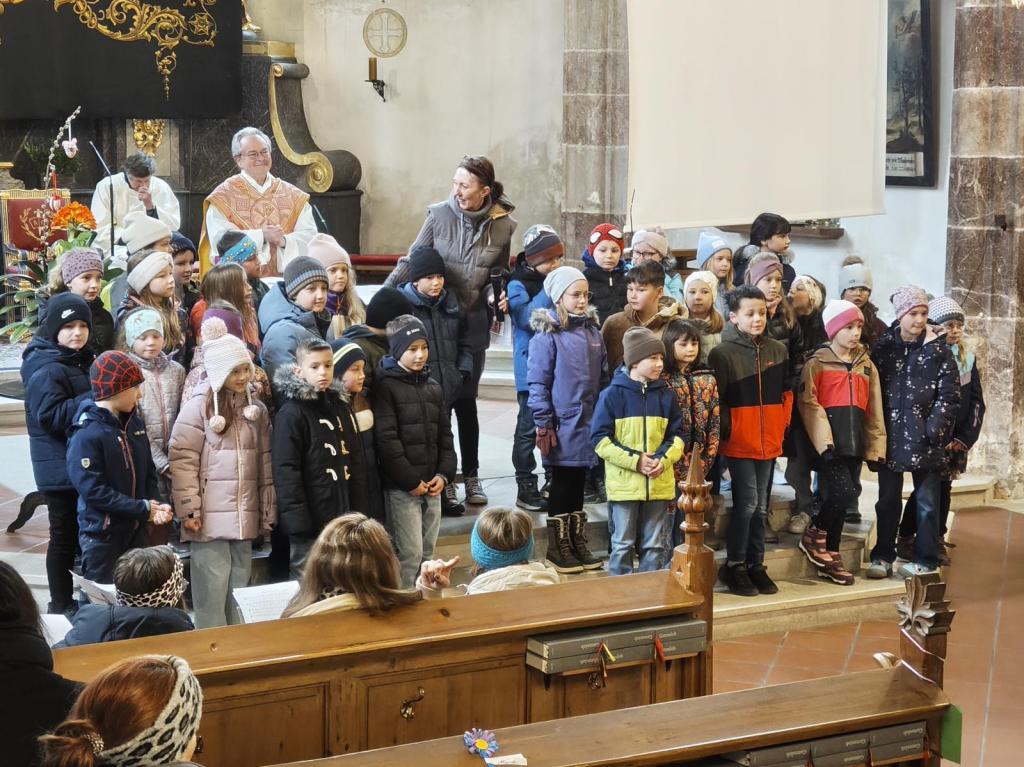 Mit den Liedern „Der Winter kimmt“, „Ihr Kinderlein kommet“ und – passend zum Text über den heiligen Franziskus – „Alle Vöglein sind schon da“ sorgten unsere Schülerinnen und Schüler für eine schöne vorweihnachtliche Stimmung in der Kirche. Begleitet wurden sie auf der Rumpl von Gerhard Köfler. Die Kinder waren mit großem Einsatz dabei – der Auftritt war sehr gelungen. Wir sind stolz auf unsere MuTh-Gruppe!