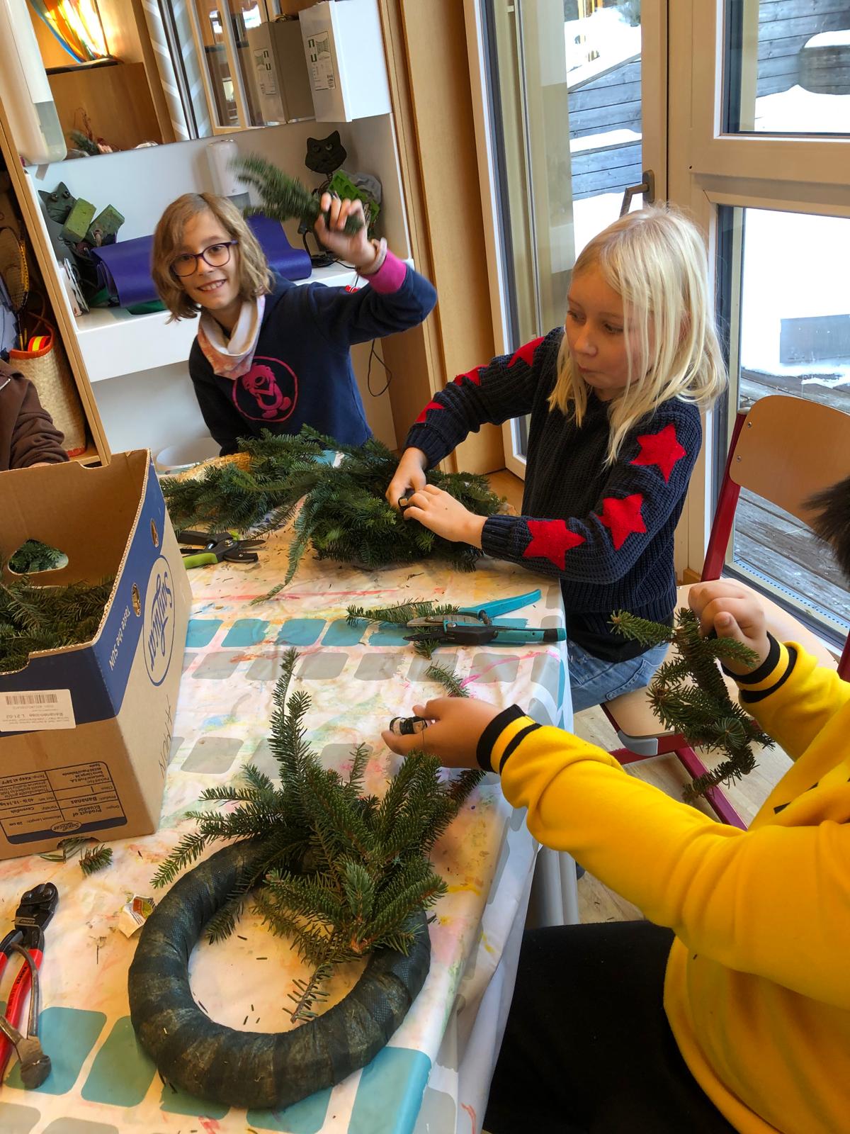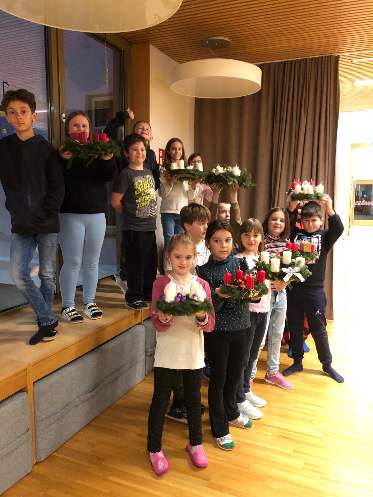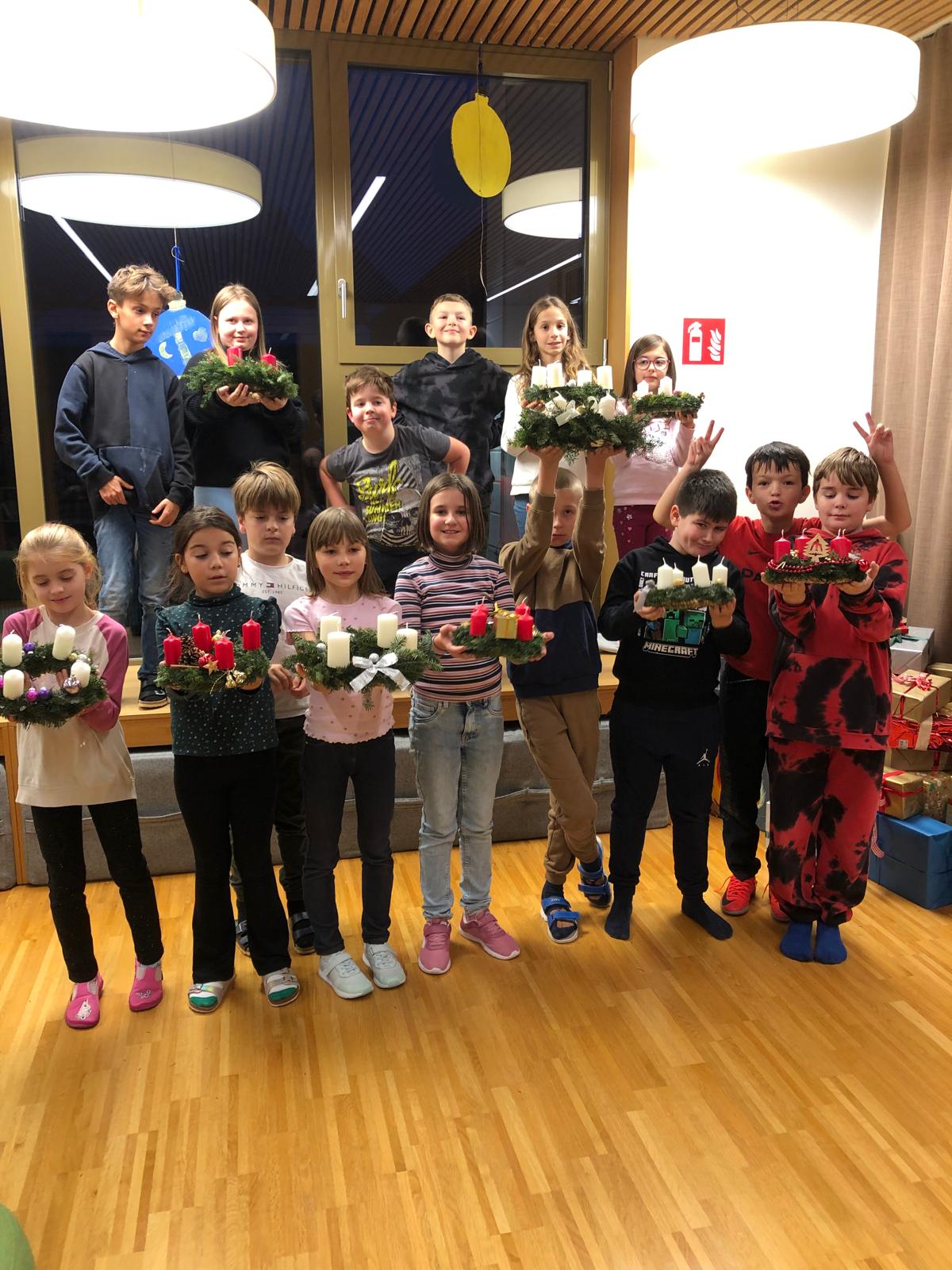 Jedes Jahr dürfen die Kinder der Adventkränze binden. De Kinder gestalteten ihre eigenen Kränze mit Tannenzweigen, Kerzen und Dekorationen. Mit viel Kreativität und Freude wurden die Kränze zusammengestellt und die Kerzen platziert.