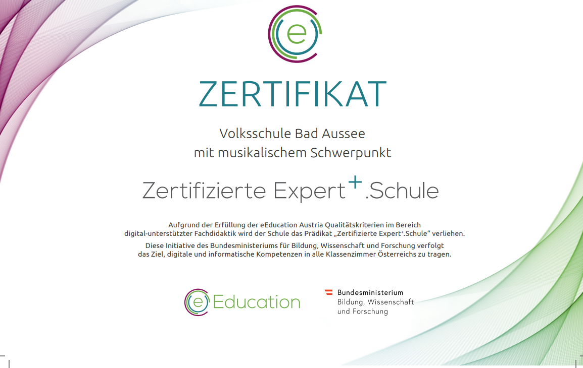 Die Volksschule Bad Aussee erhielt von „eEducation Austria“ die Auszeichnung als Expert+.Schule. Diesen Status erhalten Schulen, die mit verschiedenen Maßnahmen innovatives Lernen im Bereich digitale Bildung vorantreiben und umsetzen.