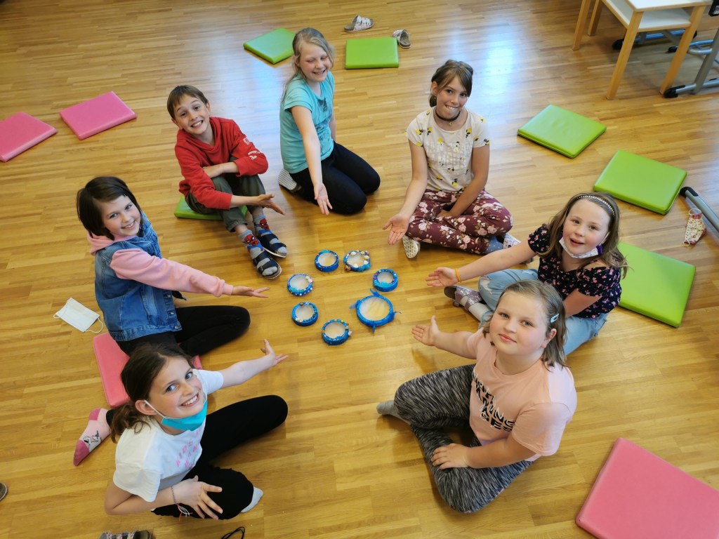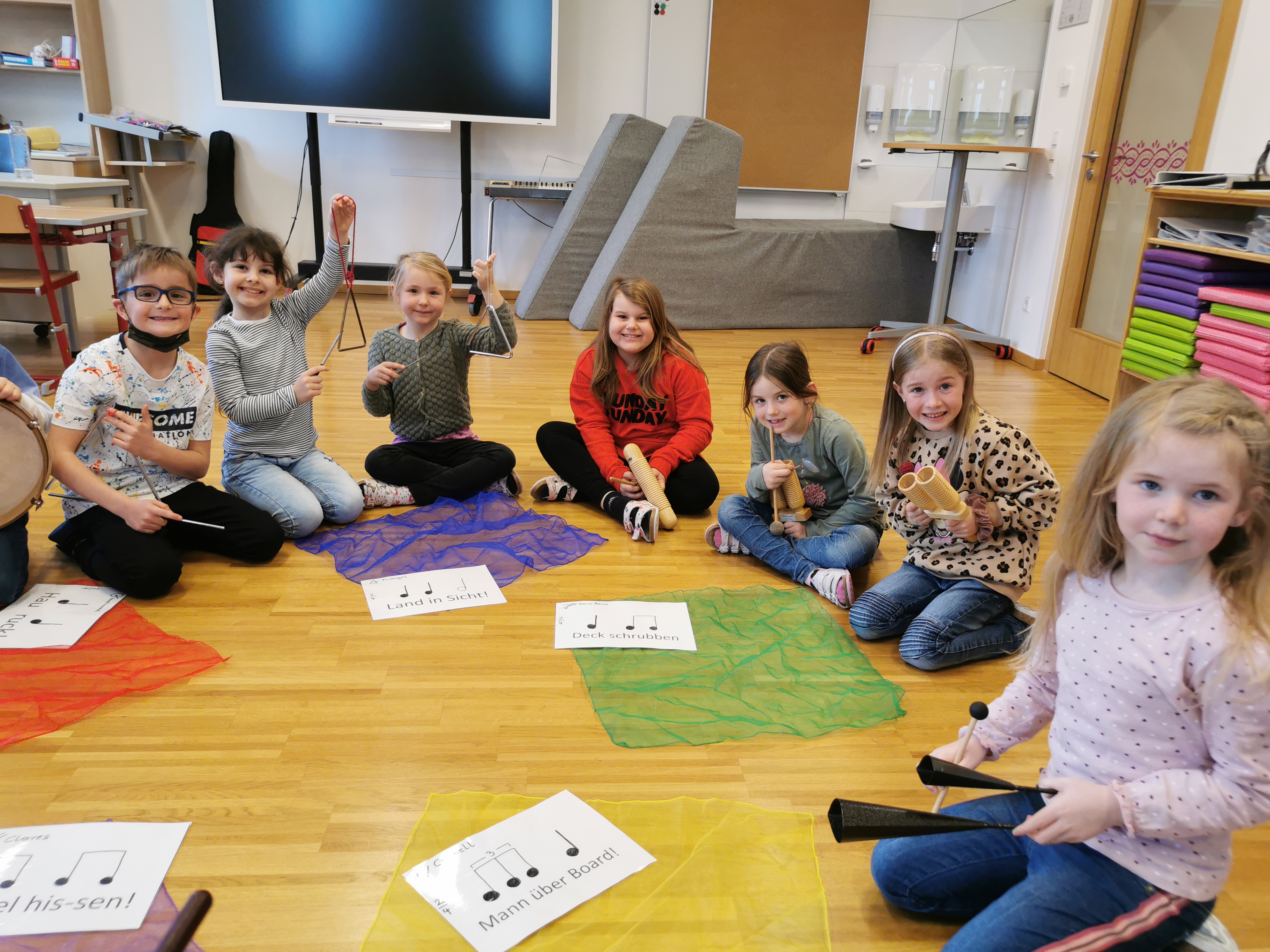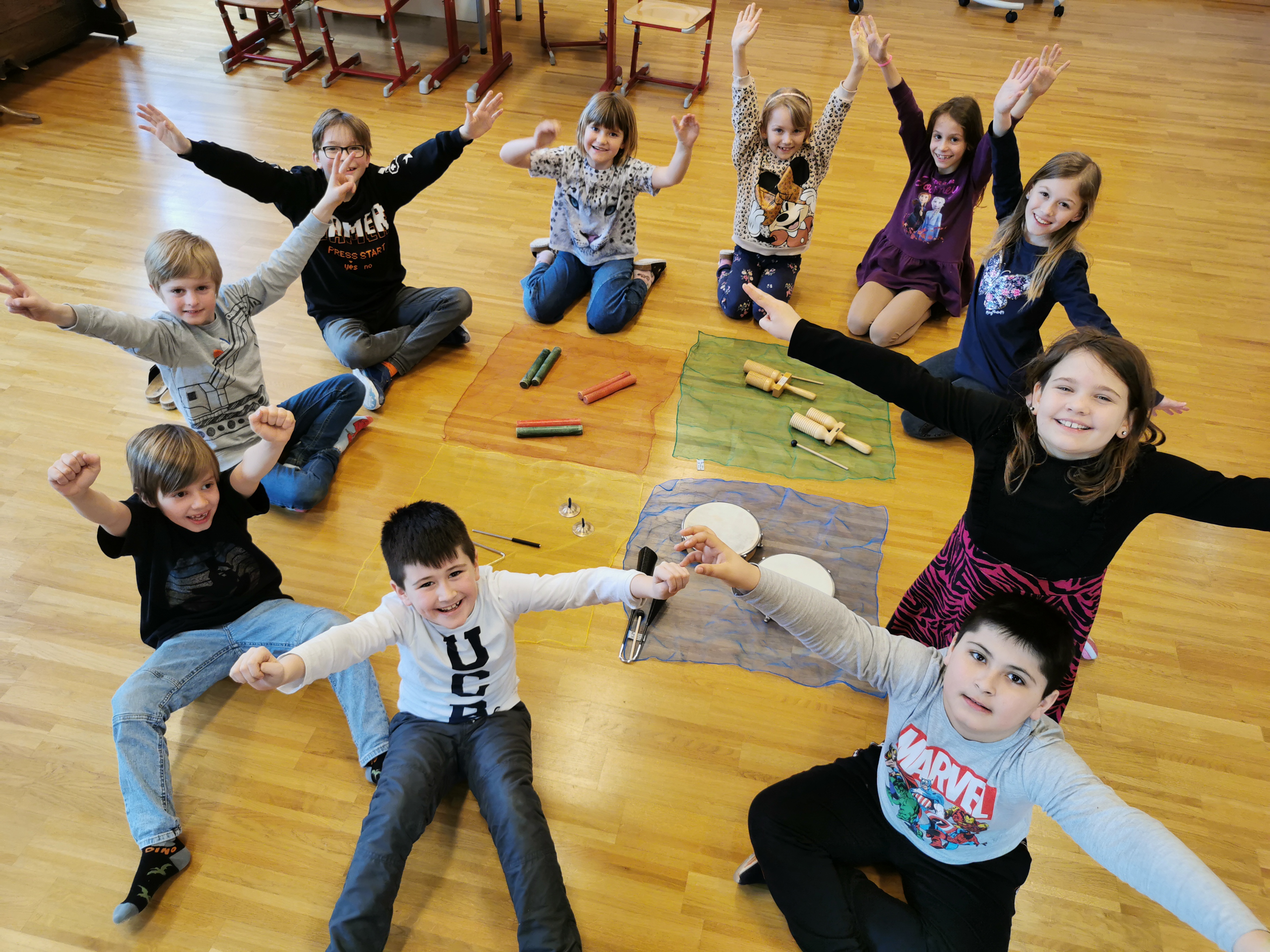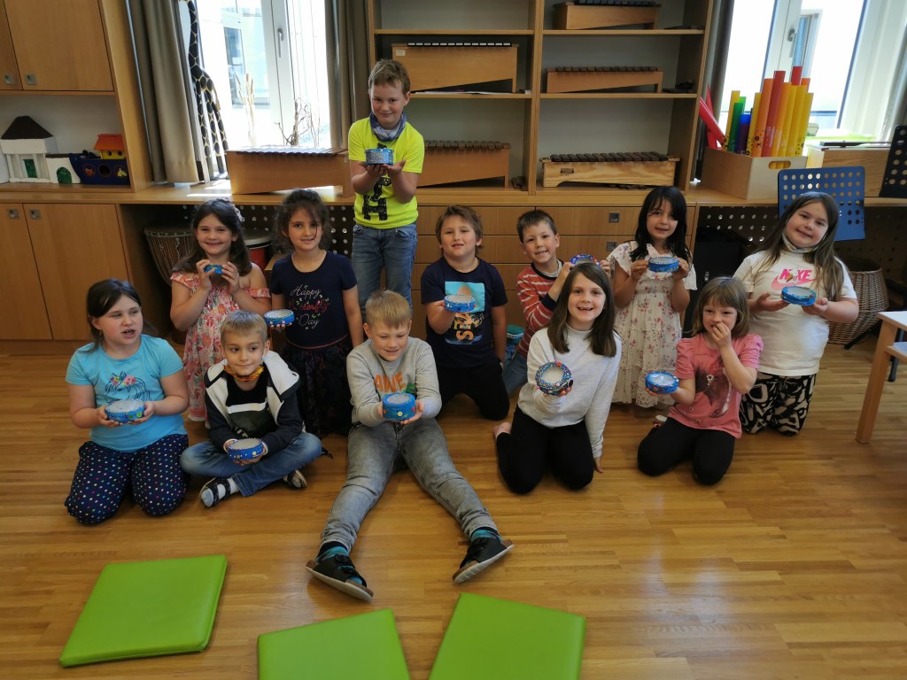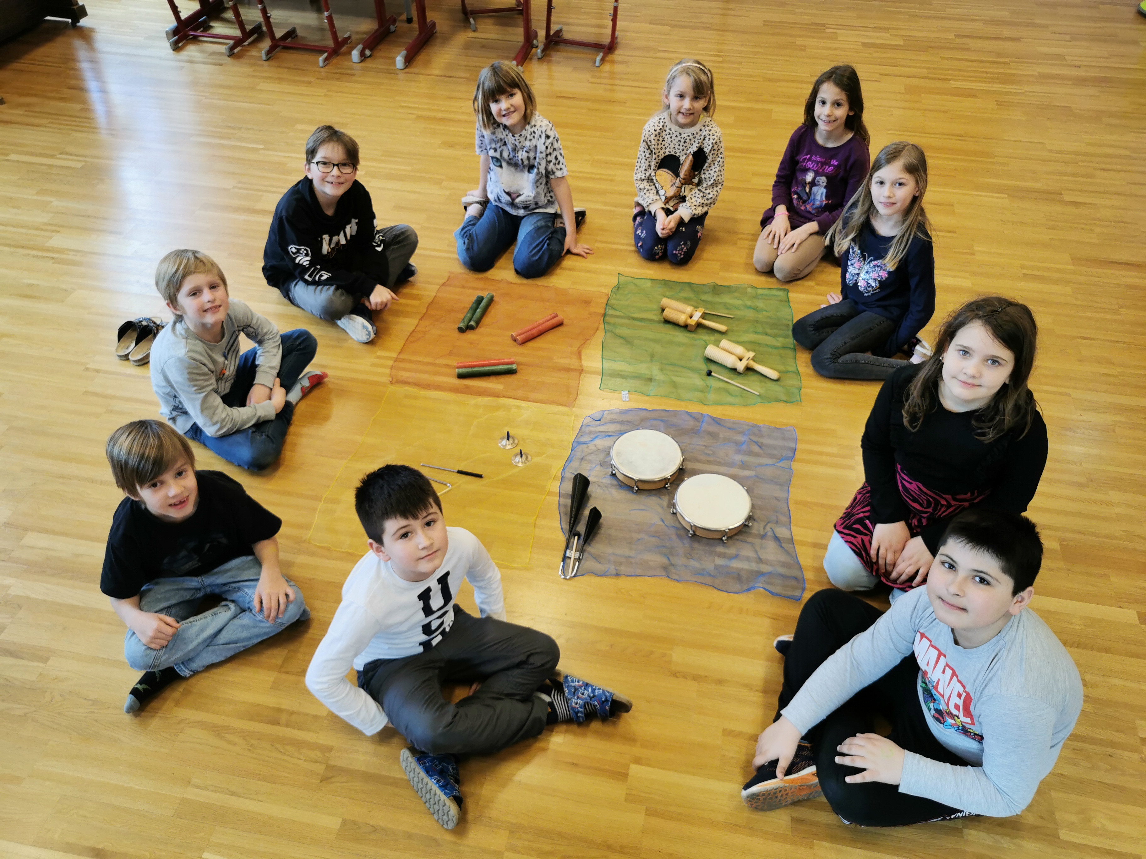 - Kennenlernen von Musikinstrumenten (erstes Verständnis für unterschiedliche Bauart und Funktion von Musikinstrumenten); Freies Ausprobieren und Einsetzen des vorhandenen (Orff-) Instrumentariums