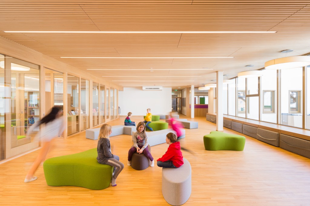Die Aula ist zugleich Spiel- und Lernbereich und ermöglicht Veranstaltungen im eigenen Schulhaus